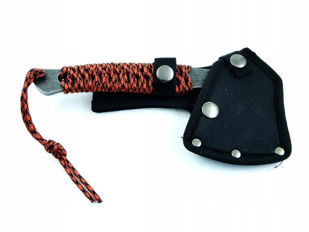 W zestawie z toporkiem znajduje się pokrowiec na ostrze z możliwością przymocowania do pasa.