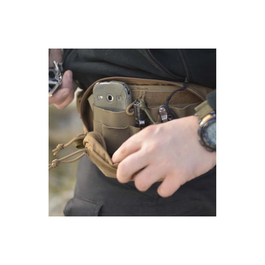 Dzięki regulowanemu, odpinanemu pasowi nerka jest przystosowana dla osób prawo i leworęcznych. Kilka pętli z taśmy pozwoli zintegrować nerkę z innymi elementami w systemie MOLLE/PALS. Na froncie znajduje się panel velcro pozwalający na łatwą personalizację za pomocą odpowiednich naszywek.