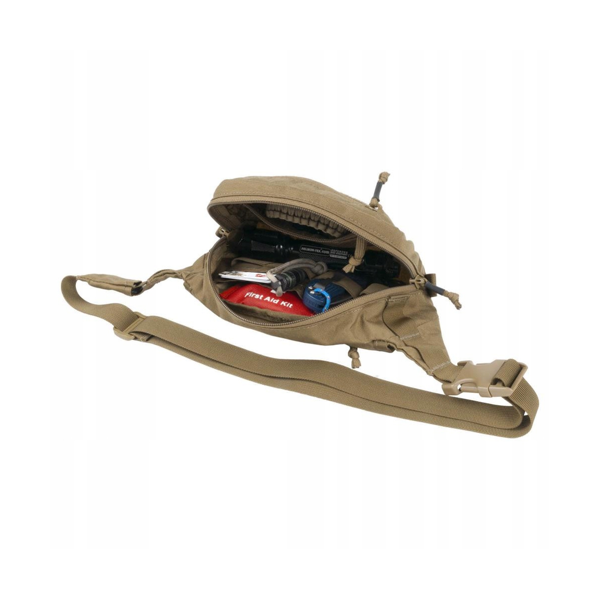 Na przodzie znajduje się panel Velcro co pozwala na doczepienie naszywek. Torba została wykonana z wysokiej klasy Cordury 500D, którą wykorzystuje się również w wszelkim oporządzeniu taktycznym (kamizelki, ładownice, plecaki). W biodrówce wykorzystano zamki YKK.