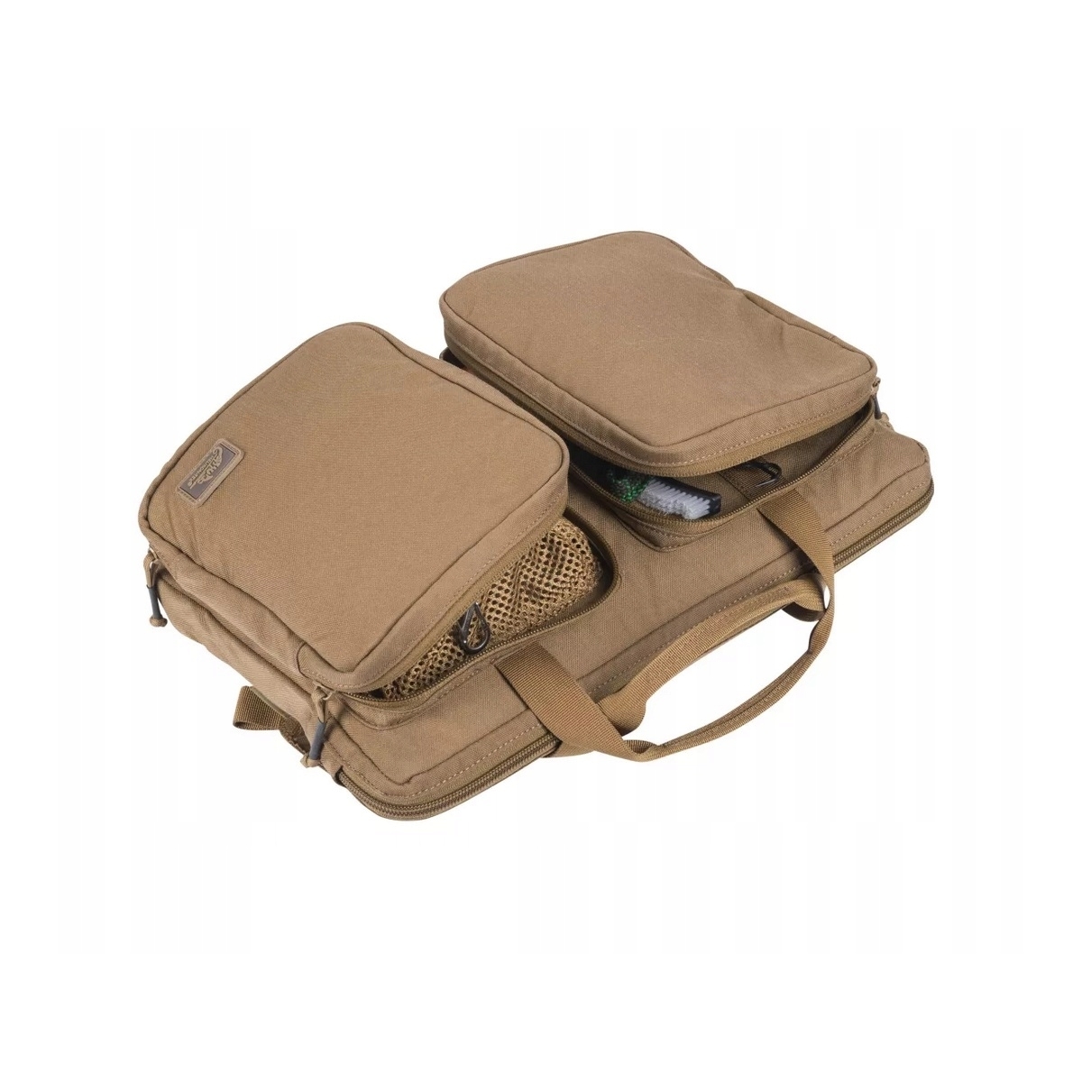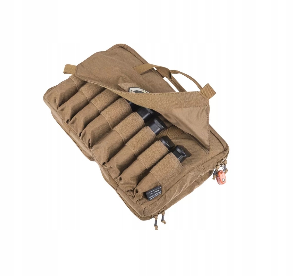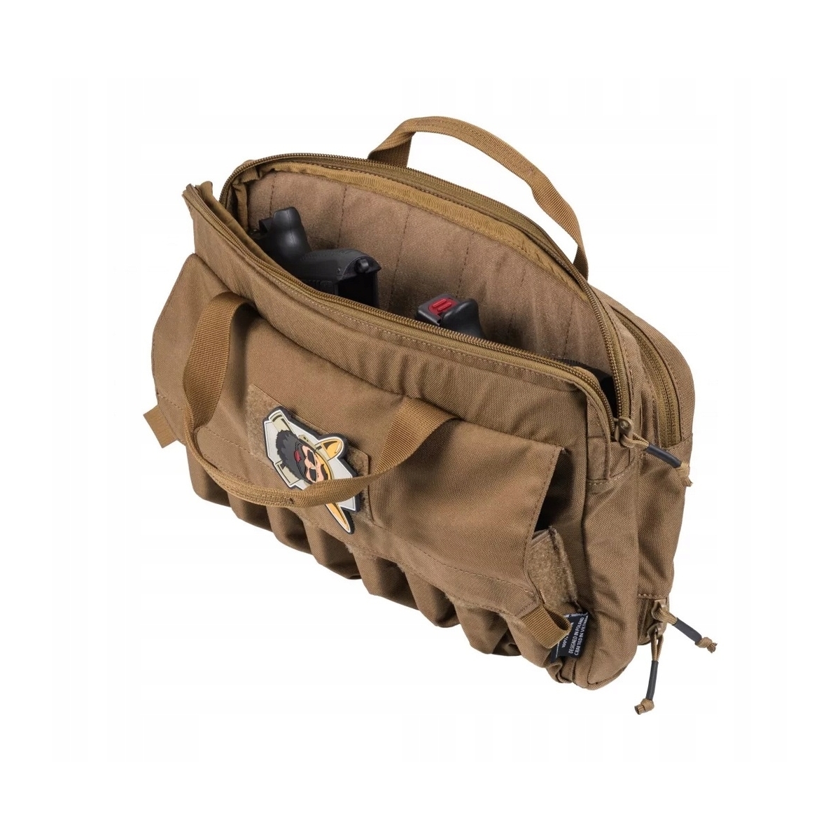 Pokrowiec Helikon Multi Pistol Wallet Coyote - przeznaczony do wygodnego przenoszenia dwóch, pełnowymiarowych pistoletów wraz z dodatkowymi akcesoriami. Pistolety przenoszone są w zamykanej na zamek komorze, zabezpieczonej miękką pianką i obszytej welurowym rzepem. Na zewnętrznej części, jednego z boków znajdują się dwie kieszenie zapinane na zamek – kieszeń uniwersalna oraz jedna przeznaczona na zestaw do czyszczenia broni, wyposażona dodatkowo w „brudną” sekcję. Natomiast na drugim boku znajduje się osiem kieszonek do przenoszenia magazynków pistoletowych. Do przenoszenia torby służą dwa, wygodne uchwyty.