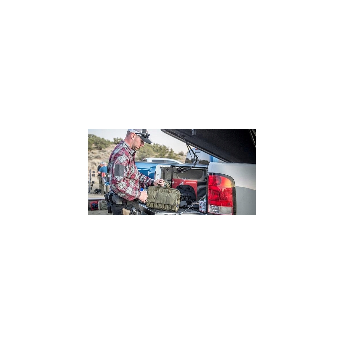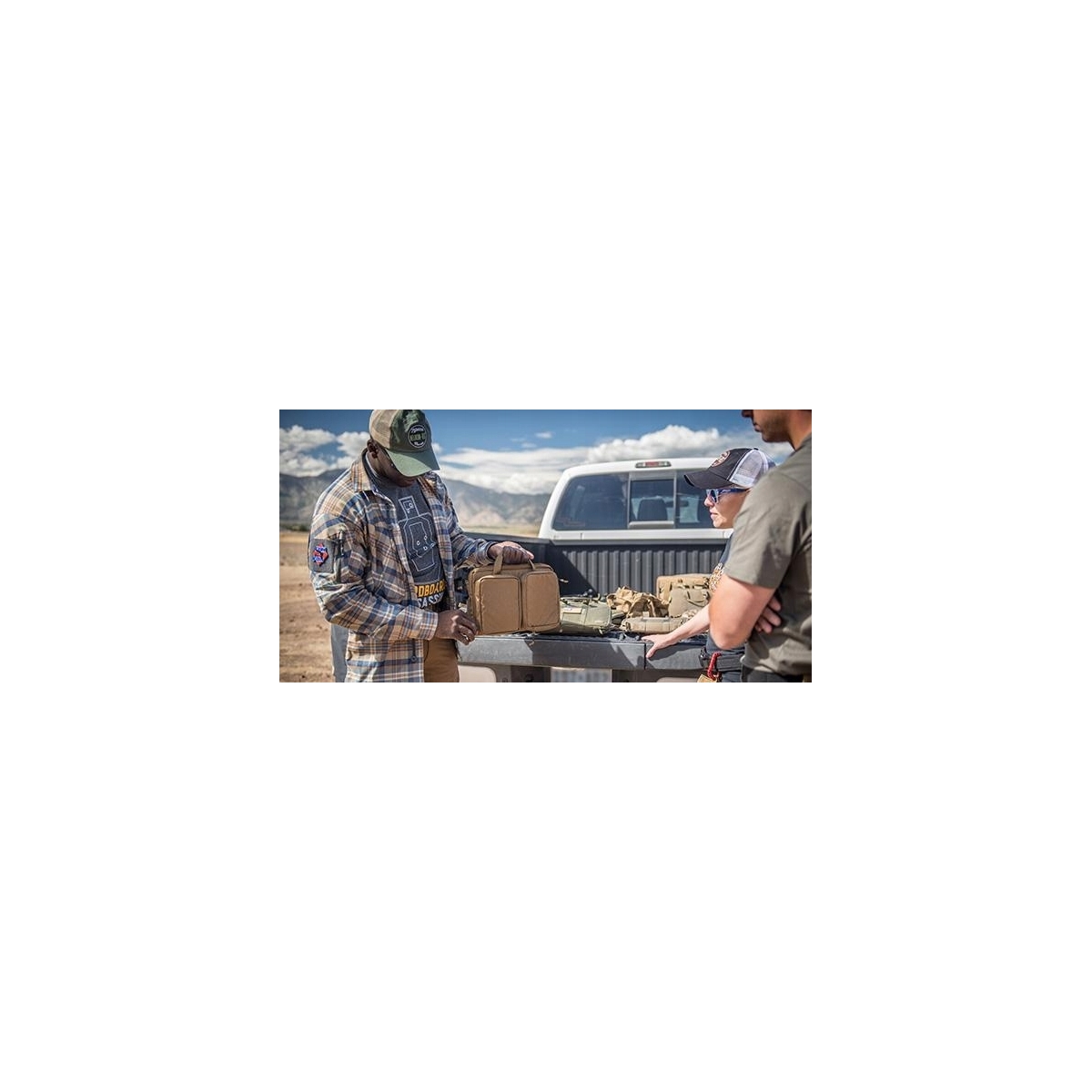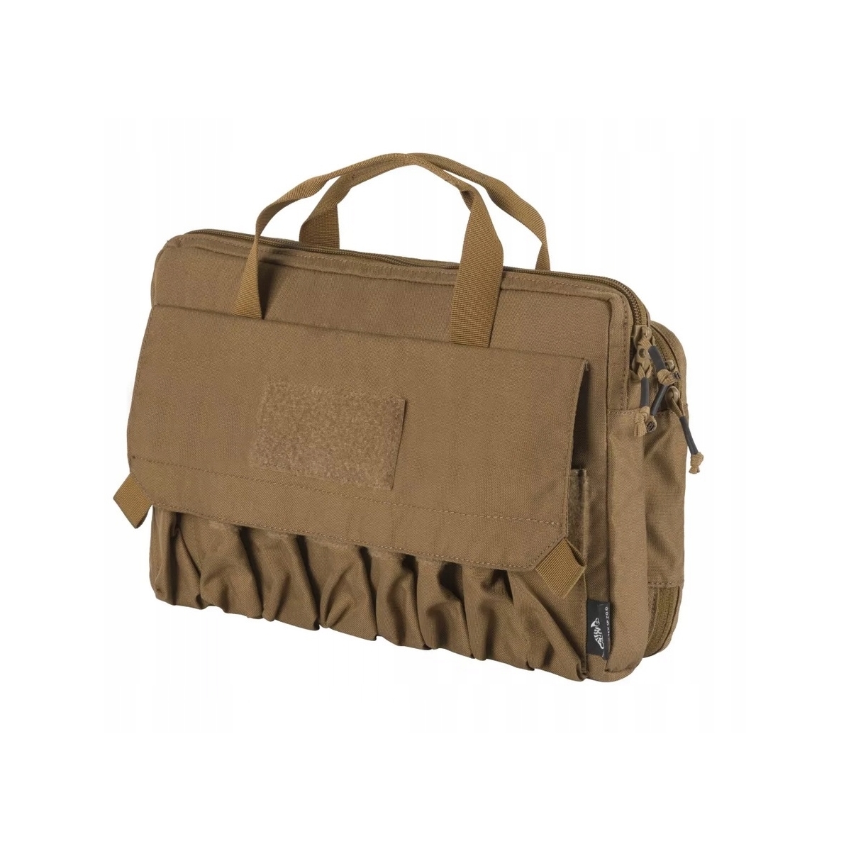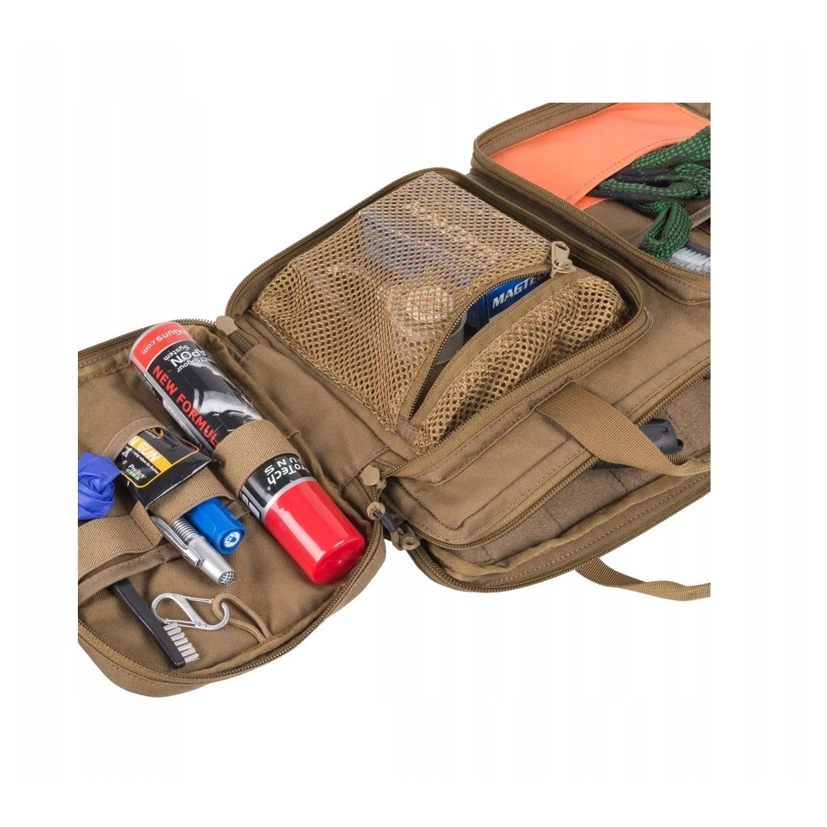 Pokrowiec Helikon Multi Pistol Wallet Coyote - przeznaczony do wygodnego przenoszenia dwóch, pełnowymiarowych pistoletów wraz z dodatkowymi akcesoriami. Pistolety przenoszone są w zamykanej na zamek komorze, zabezpieczonej miękką pianką i obszytej welurowym rzepem. Na zewnętrznej części, jednego z boków znajdują się dwie kieszenie zapinane na zamek – kieszeń uniwersalna oraz jedna przeznaczona na zestaw do czyszczenia broni, wyposażona dodatkowo w „brudną” sekcję. Natomiast na drugim boku znajduje się osiem kieszonek do przenoszenia magazynków pistoletowych. Do przenoszenia torby służą dwa, wygodne uchwyty.