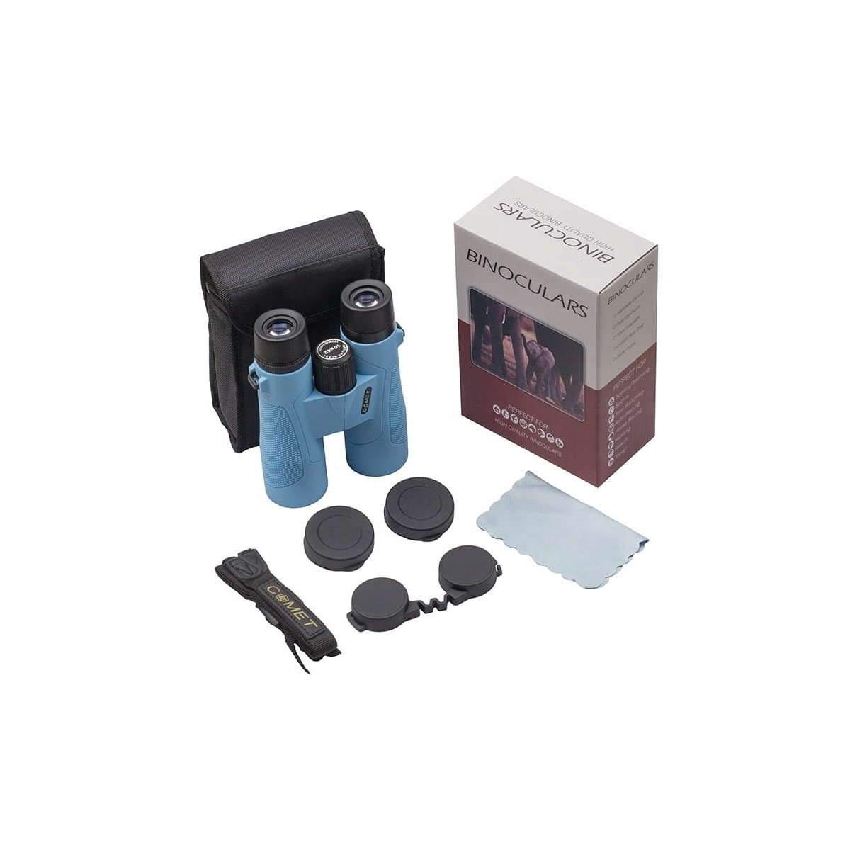- W zestawie: lornetka COMET LR-058e, dekielki ochronne, futerał z paskiem, ściereczkę do czyszczenia, pasek do zawieszenia lornetki na szyi oraz pudełko.