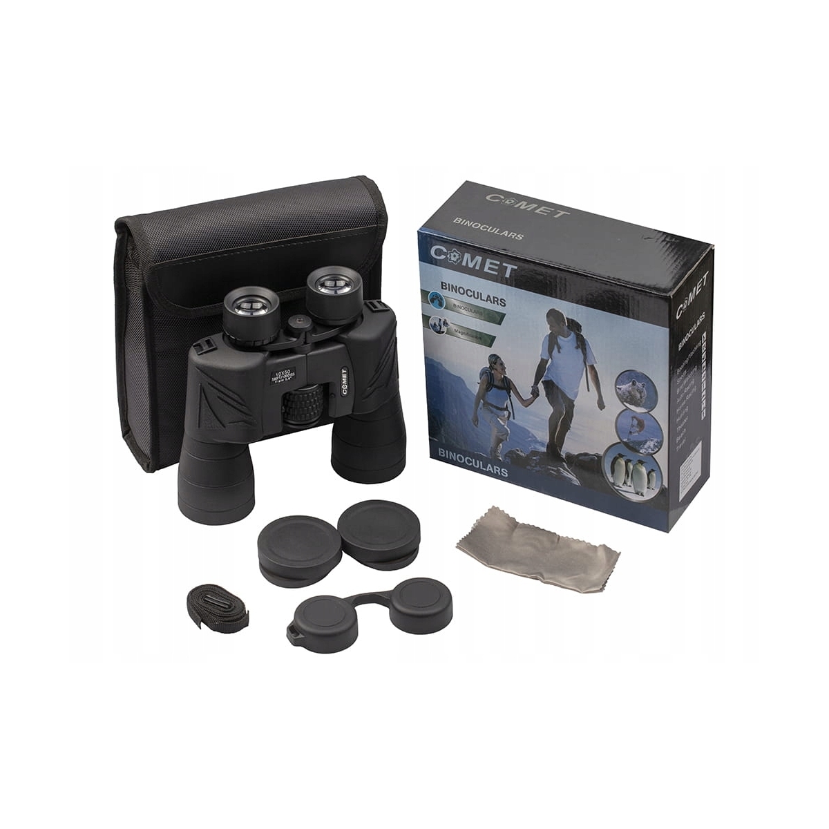 W zestawie: lornetka COMET LR-104, zatyczki, futerał z paskiem, ściereczka do czyszczenia, pasek do zawieszenia na szyi oraz pudełko.