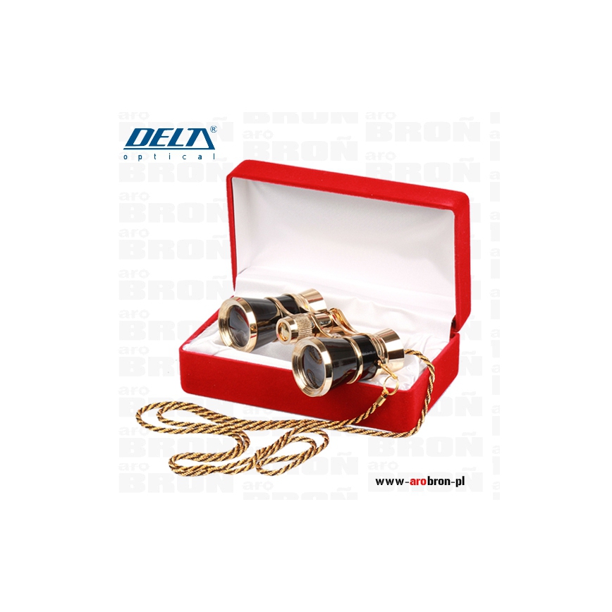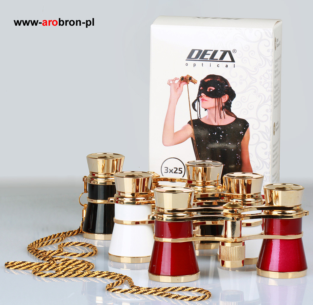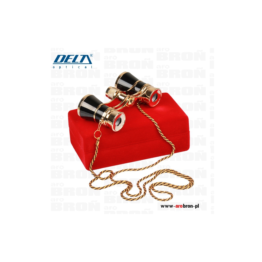 Lornetka teatralna Delta Optical 3x25 Czarna - to elegancka i stylowa lornetka ze złotym łańcuszkiem, zapakowana w eleganckie, prezentowe pudełko. Lornetka o powiększeniu 3 x świetnie nadaje się do obserwacji spektakli w teatrach, operach bądź filharmoniach, jak również może być niebanalnym dodatkiem do wieczornej kreacji. Lornetka jest lekka i ma zaledwie 10 cm co sprawia, że zmieści się do każdej kopertówki. Lornetka dostępna w 3 wersjach kolorystycznych: czarna, czerwona i perłowa.