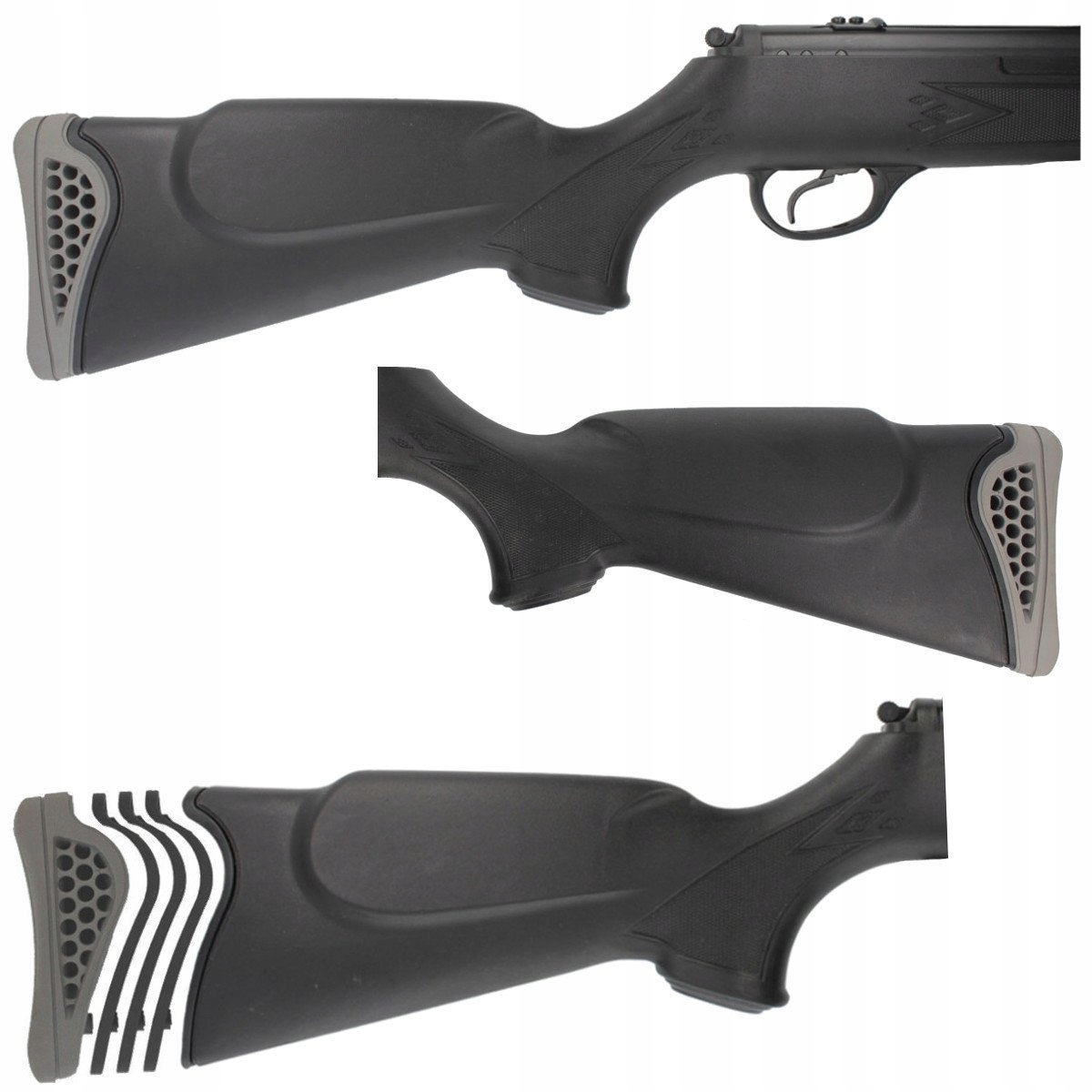 - Wentylowana gumowa stopka TrioPad® (trzy rodzaje wymiennych stopek) na końcu kolby umożliwia regulację jej długości oraz absorbuje energię odrzutu po oddanym strzale.
