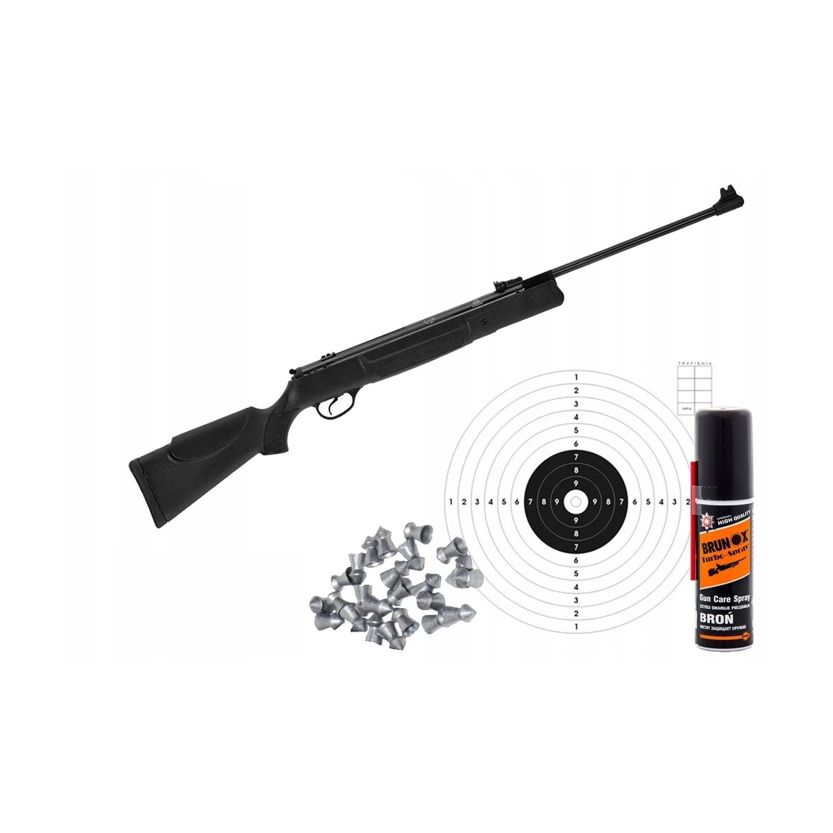 W zestawie: karabinek Hatsan 90 gen-2, luneta Kandar 3-9x40, montaż 2-częściowy do lunety, olejek Brunox 25ml, opakowanie śrutu 250szt 5,5mm, komplet tarcz 14x14cm.