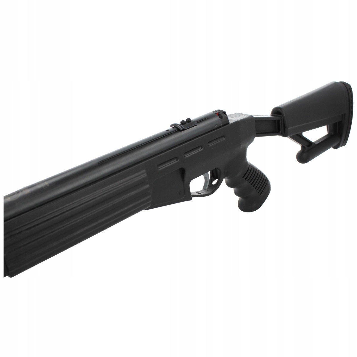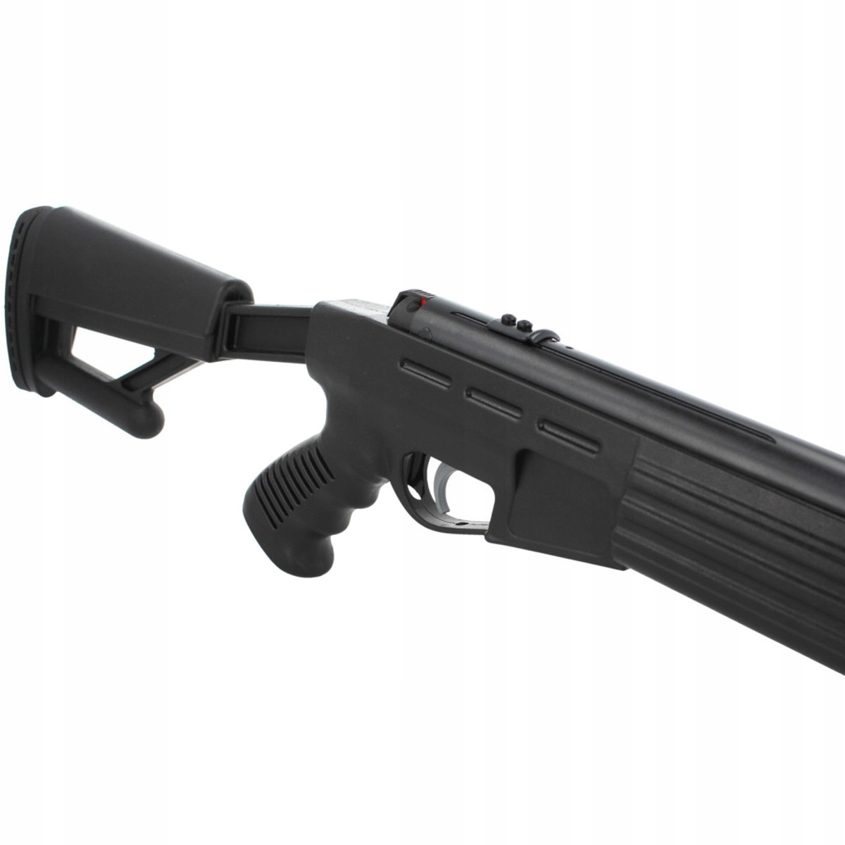 - Taktyczna kolba z chwytem pistoletowym wykonana z trwałego polimeru.