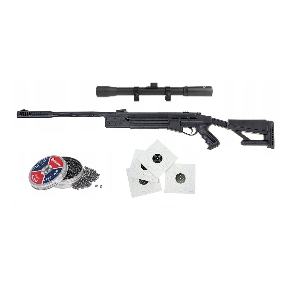 W zestawie: Airtact QE 4,5mm, luneta 3-9x40 z montażem dwuczęściowym, olejek Brunox 25ml, opakowanie śrutu 250szt 4,5mm, komplet 20szt tarcz 14x14cm, 5szt lotek 4,5mm.