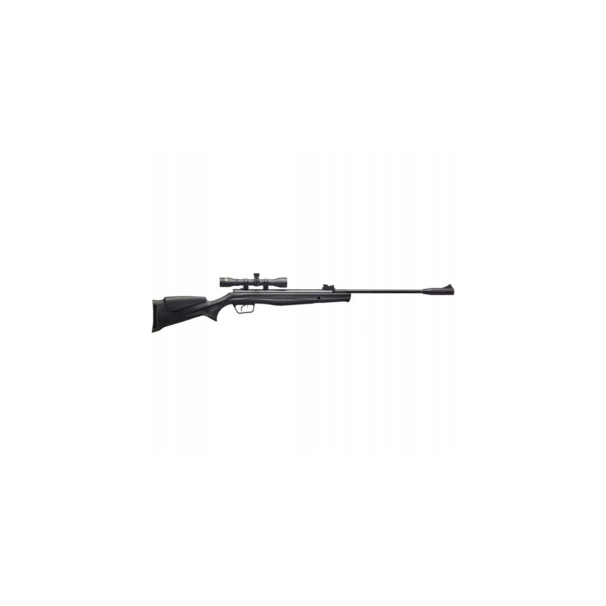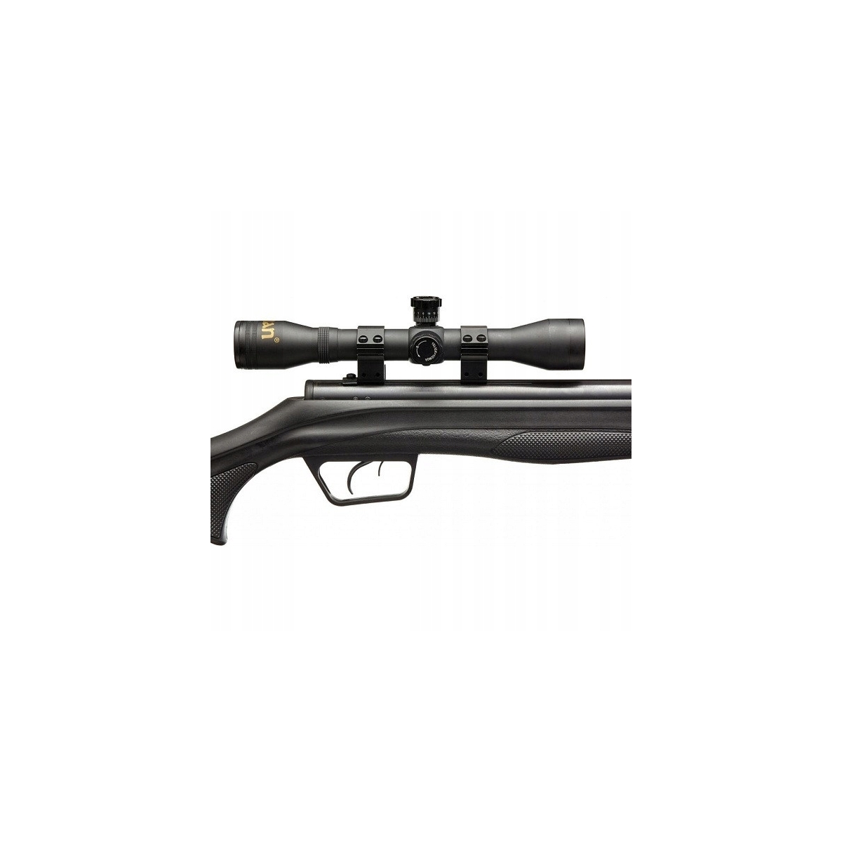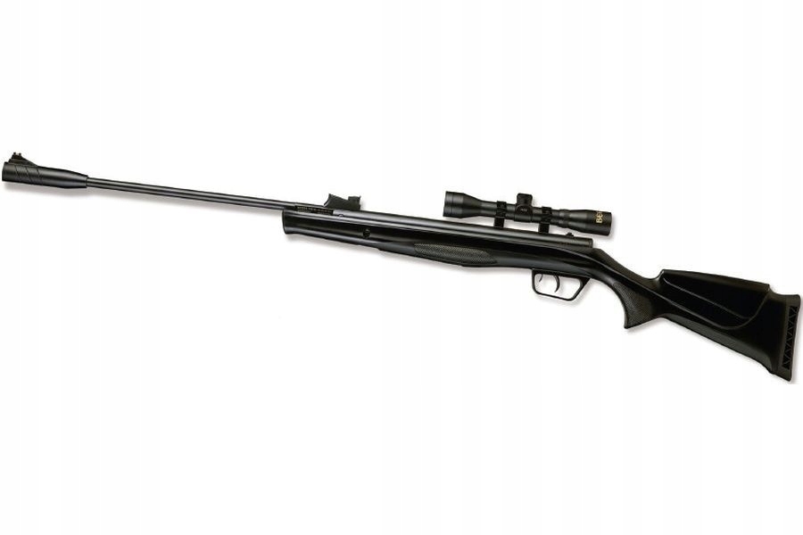 Dodatkowo karabinek wyposażony został w szynę do montażu optyki celowniczej (11 mm) oraz w zestawie posiada lunetę marki Beeman 4x32 z obejmami montażowymi.