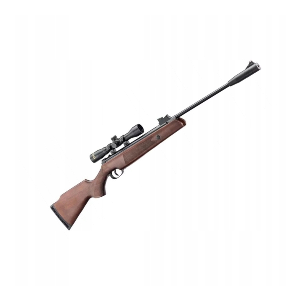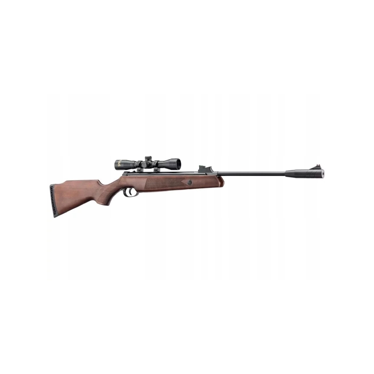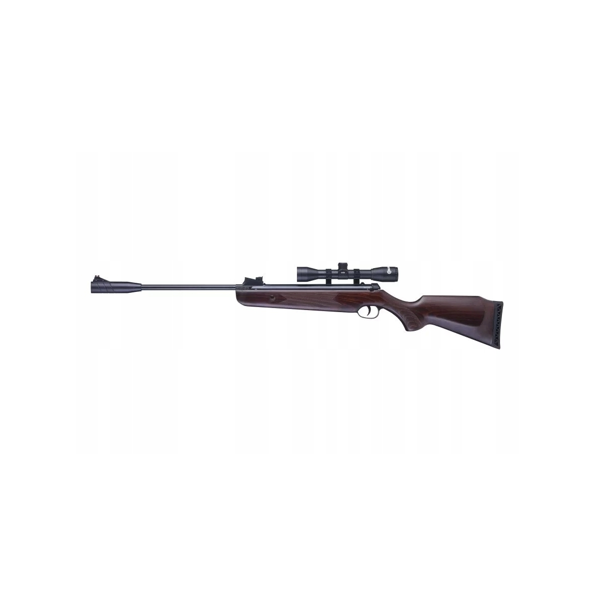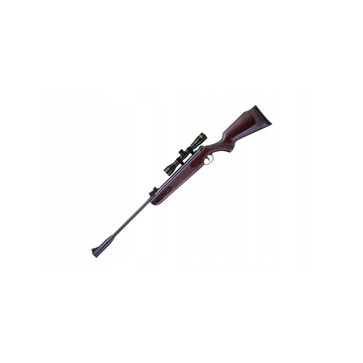 - Dodatkowo karabinek posiada szynę do montażu optyki celowniczej (11 mm) oraz w zestawie lunetę o dobrych parametrach 4x32.
