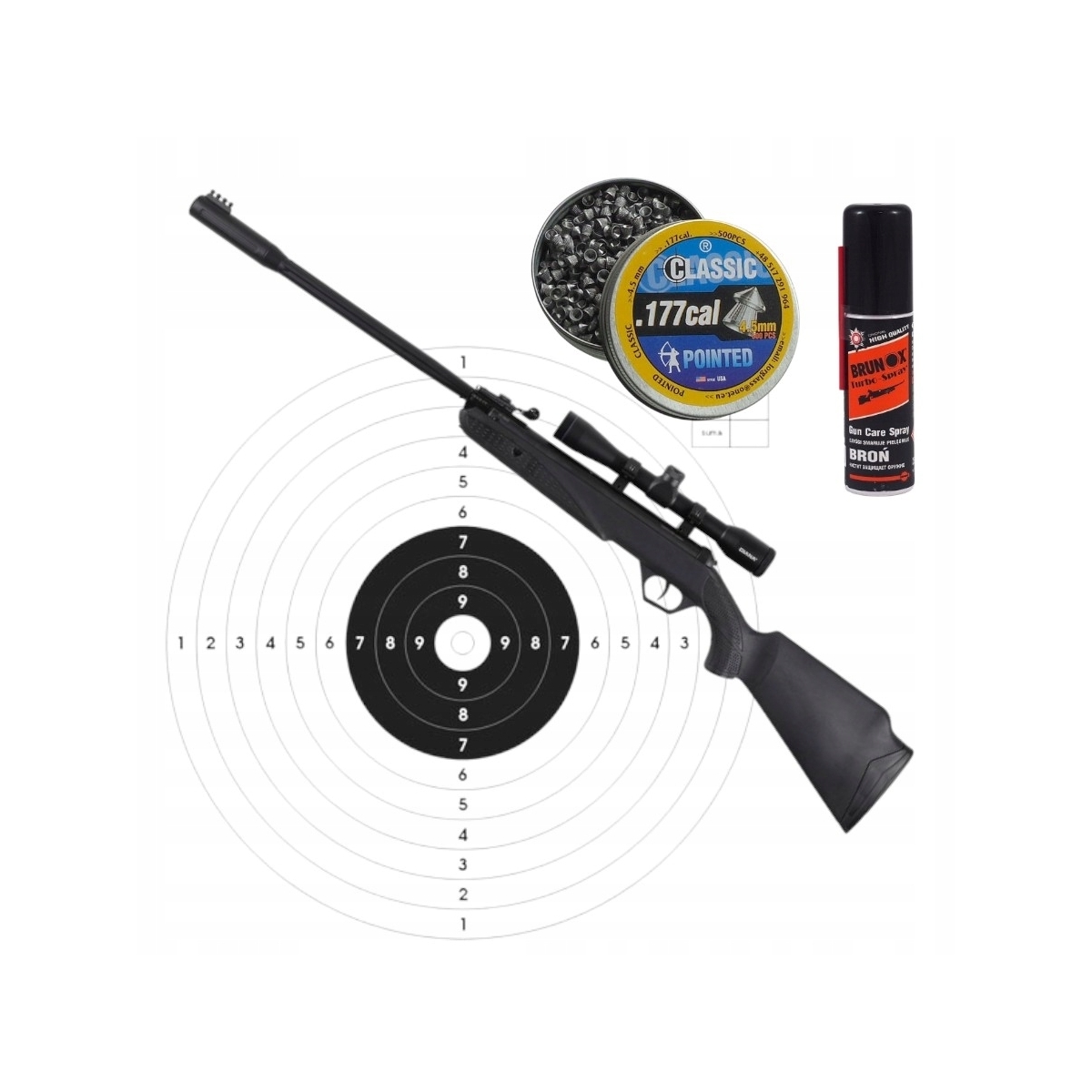 Zestaw: Wiatrówka Diana 21 FBB 4,5 mm z lunetą 4x32 + śrut + tarcze + Brunox 25 ml