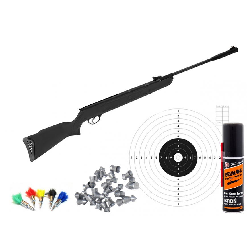 Zestaw: karabinek, opakowanie 250 szt śrutu 5,5mm, olejek Brunox 25ml, zestaw tarcz 14x14cm, 5 sztuk lotek