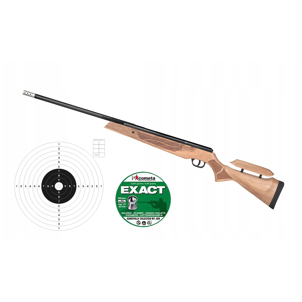 W zestawie: wiatrówka Cometa Fusion Premier Star GP 4,5 mm, opakowanie Śrutu JSB Exact 4,5 mm, komplet 50szt tarcz 14x14 cm.
