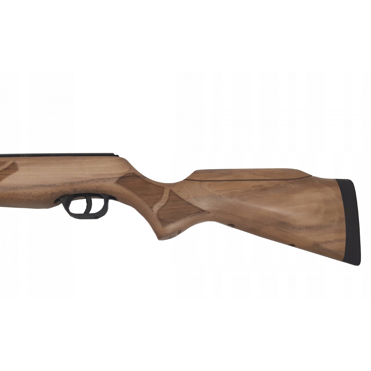 - Wiatrówka została wyposażona w automatyczny bezpiecznik, który po naciągnięciu sprężyny automatycznie blokuje spust uniemożliwiając oddanie niekontrolowanego strzału.