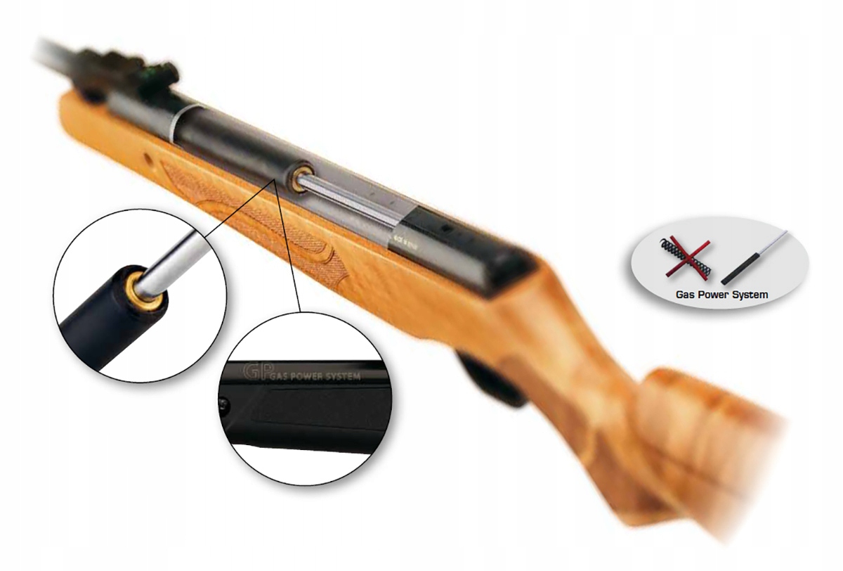 Sprężyna gazowa GP Gas Piston - gwarantuje cichą pracę wiatrówki, mniejszy odrzut, powtarzalność każdego strzału, brak zużycia sprężyny gazowej podczas całego okresu eksploatacji. Sprężyna gazowa poprawia celność wiatrówki oraz kulturę pracę.