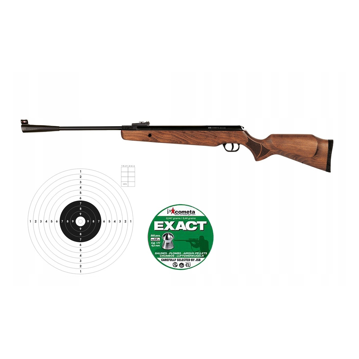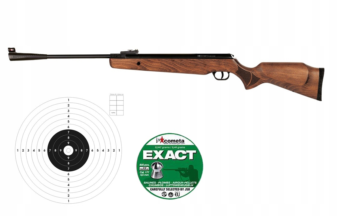 W zestawie: wiatrówka Cometa Fenix-400 GP 4,5 mm, opakowanie Śrutu JSB Exact 4,5 mm, komplet 50szt tarcz 14x14 cm.