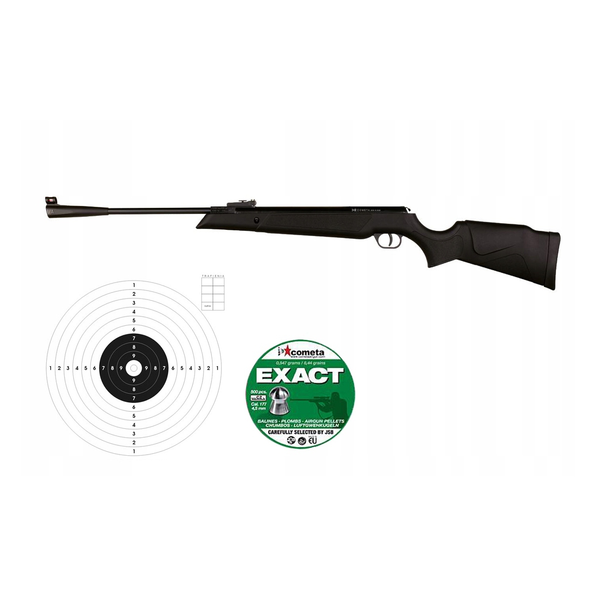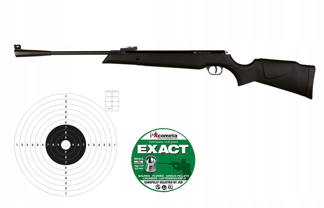 W zestawie: wiatrówka Cometa Fenix-400 Galaxy GP 4,5 mm, opakowanie Śrutu JSB Exact 4,5 mm, komplet 50szt tarcz 14x14 cm.
