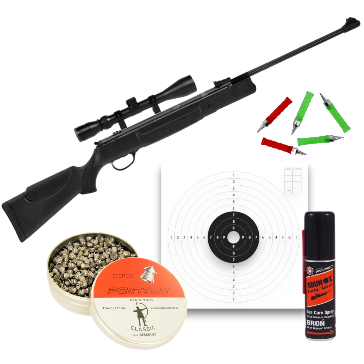 W zestawie: karabinek Hatsan 90 gen-2, luneta Kandar 3-9x40, montaż 2-częściowy do lunety, olejek Brunox 25ml, opakowanie śrutu 500szt 4,5mm, komplet tarcz 14x14cm, 5szt lotek 4,5mm.