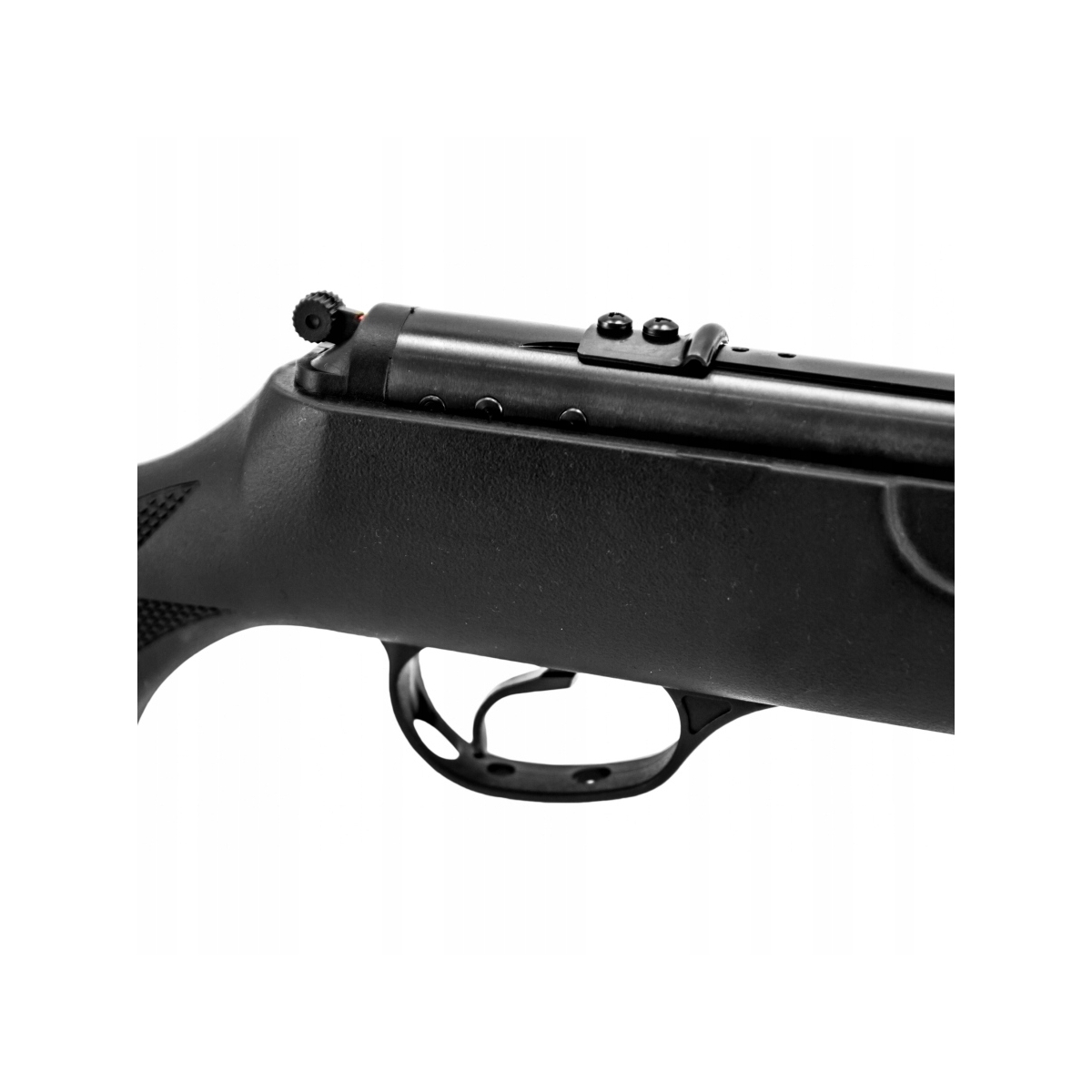 - Bezpieczeństwo obsługi – automatyczna blokada bezpiecznika zabezpieczająca wiatrówkę przed niepożądanym wystrzałem