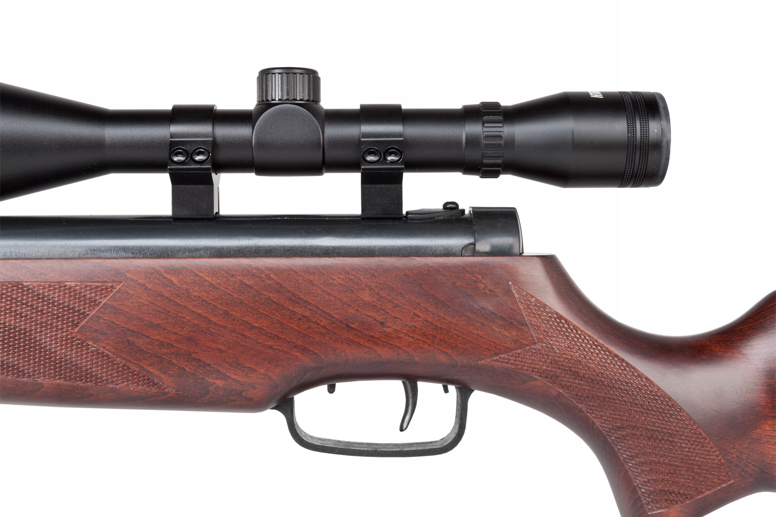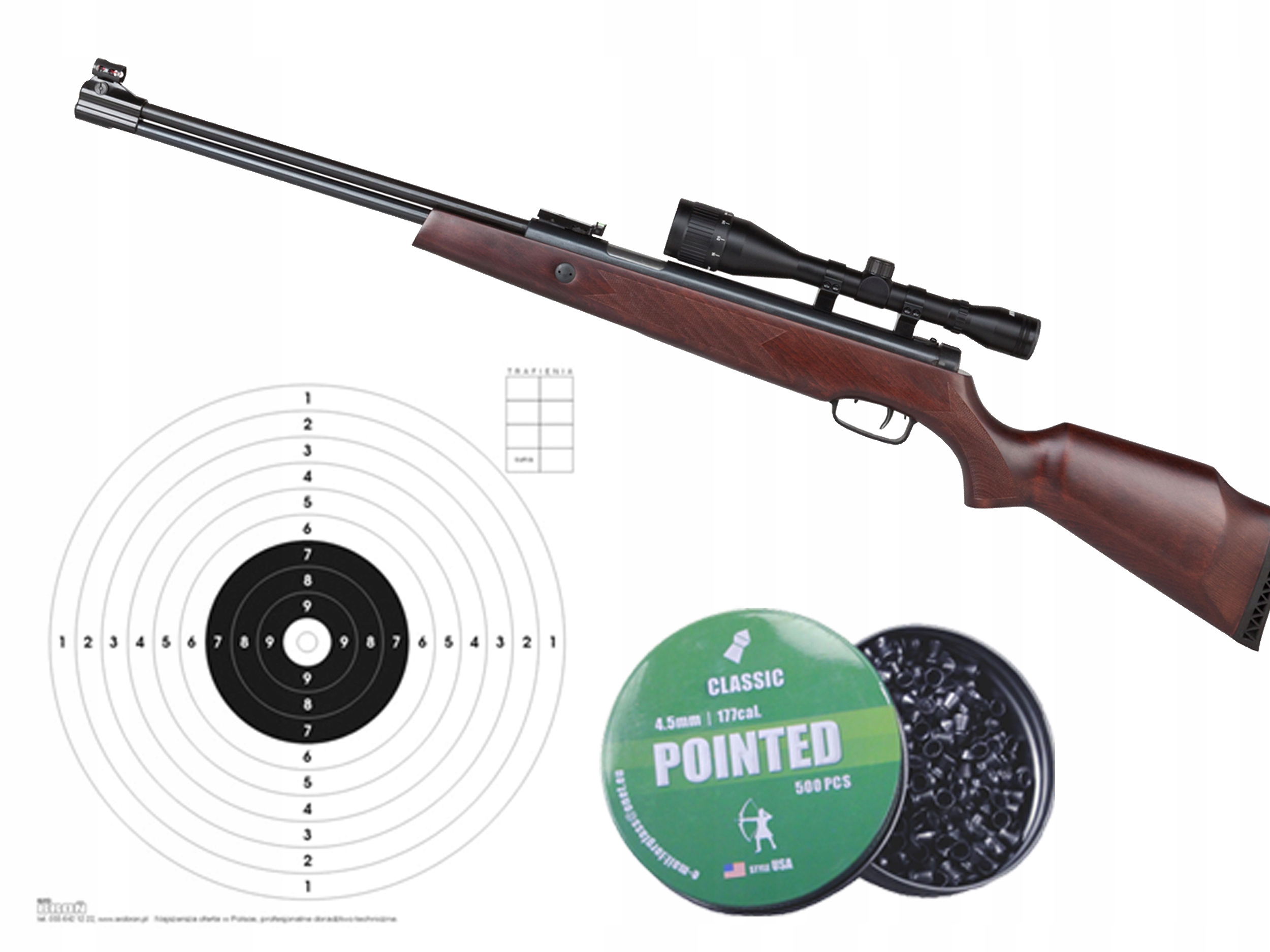 W zestawie: Wiatrówka, luneta 6x40, opakowanie 250szt śrutu 4,5mm, 20 szt tarcz 14x14cm.
