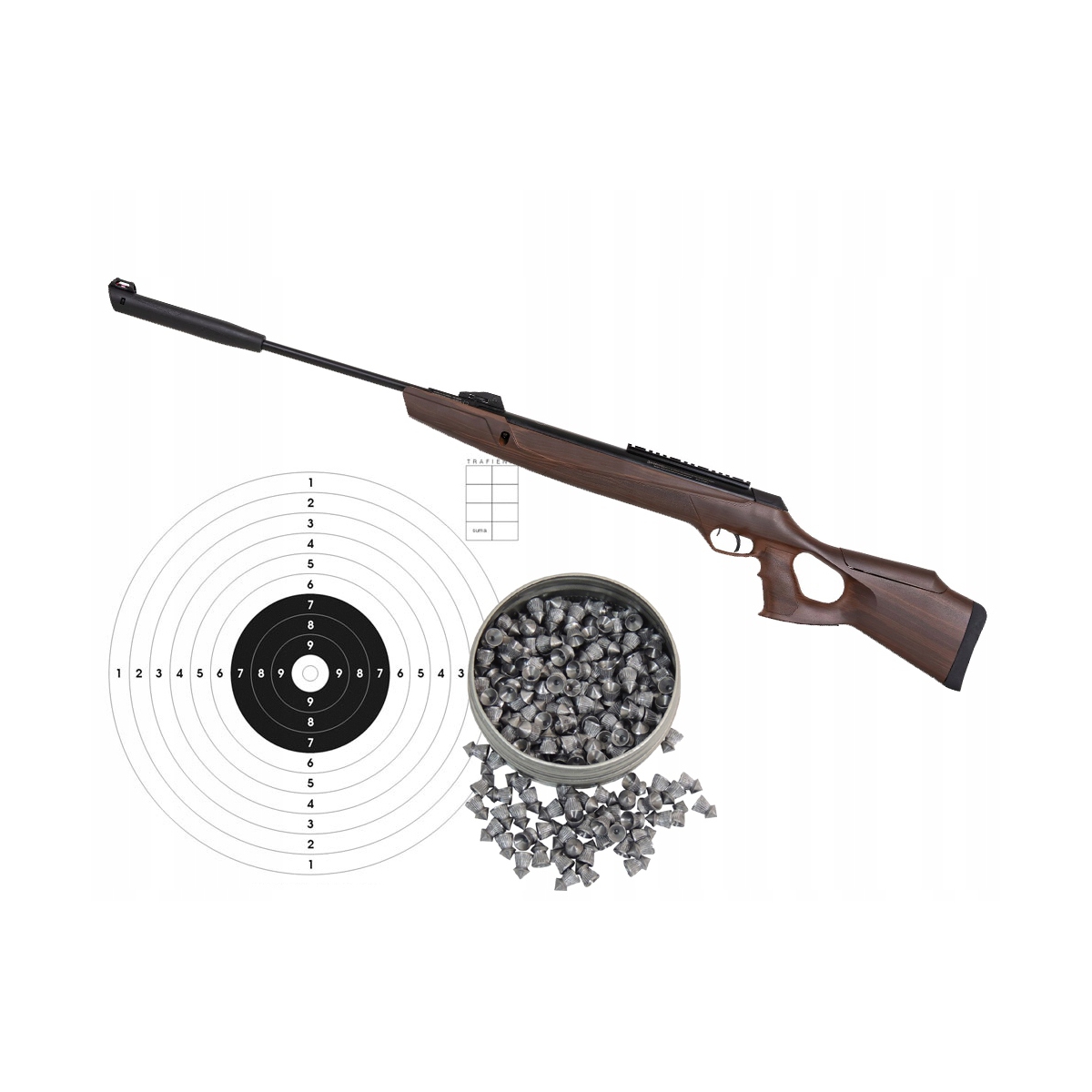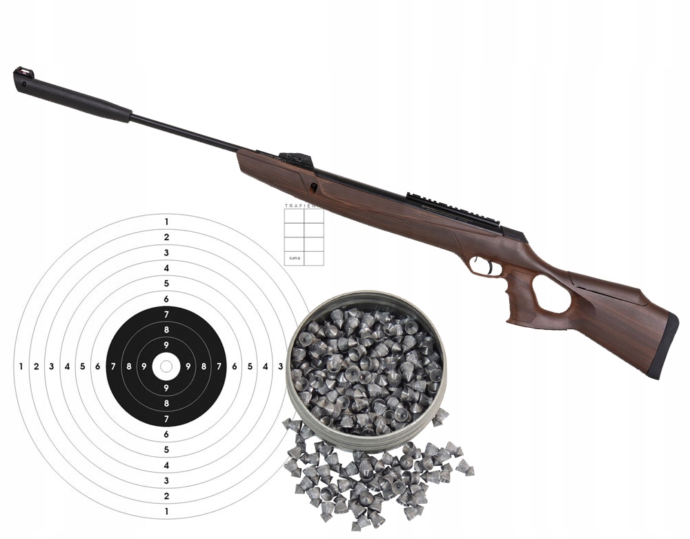 W zestawie: Wiatrówka Kral Arms N-11 Arboreal 4,5mm, opakowanie śrutu 250 szt 4,5mm, komplet 20szt tarcz 14x14cm.