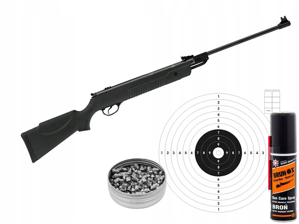 W zestawie: karabinek Hatsan 80 4,5mm, olejek Brunox 25ml, opakowanie śrutu 250szt 4,5 mm, komplet tarcz 14x14cm.