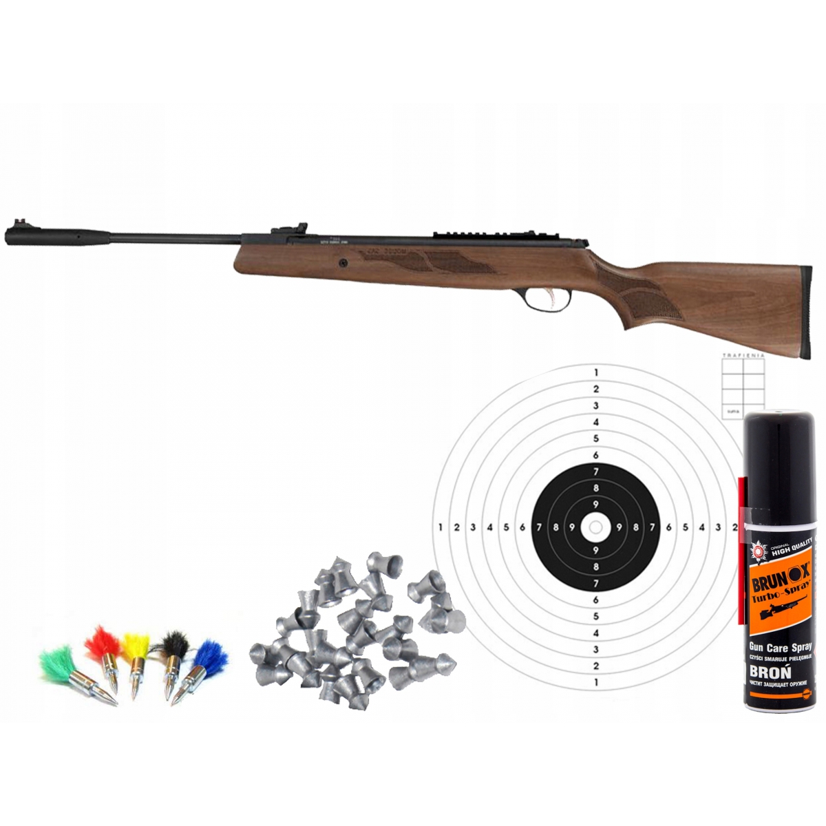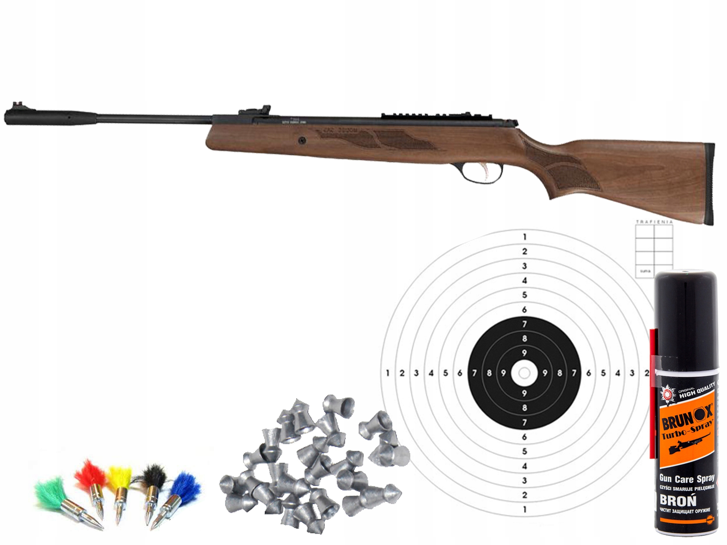 W zestawie: karabinek Hatsan 95, olejek Brunox 25ml, opakowanie śrutu 200 szt 4,5mm, komplet 20 szt tarcz 14x14cm, 3 szt lotek 4,5mm.