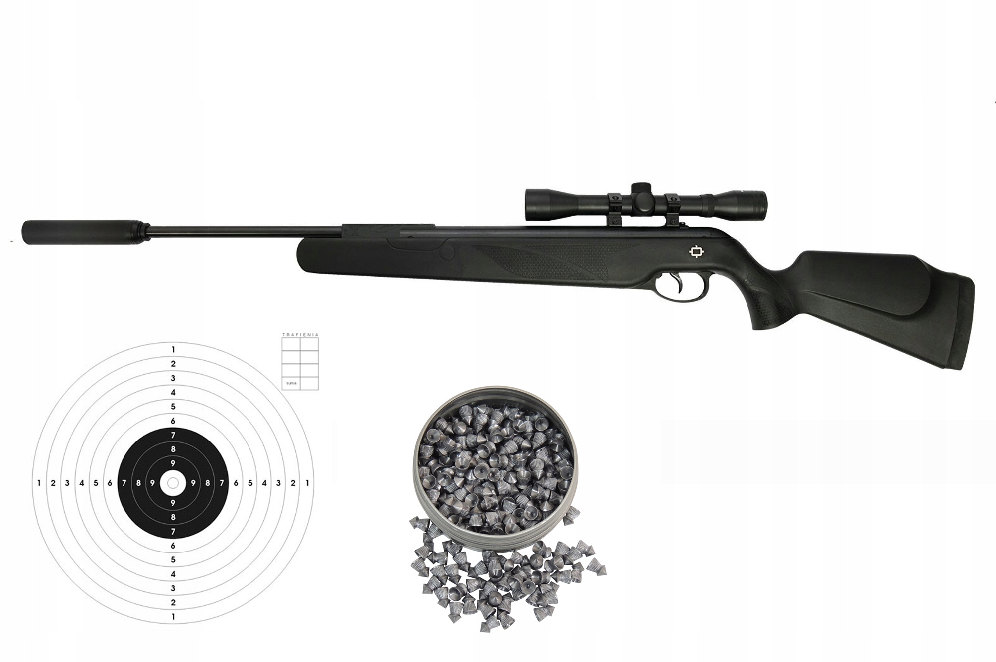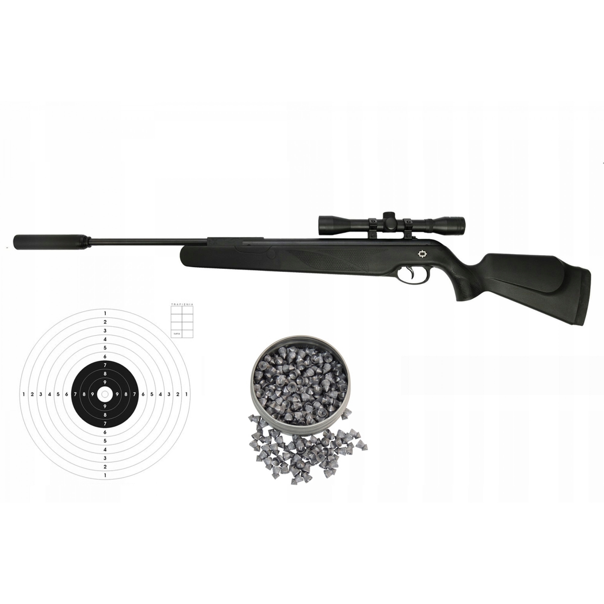 Zestaw zawiera: wiatrówkę Norica Dream Max 4,5mm, lunetę Norica 4x32, opakowanie 250szt śrutu 4,5mm oraz zestaw 20szt solidnych tarcz 14x14cm.