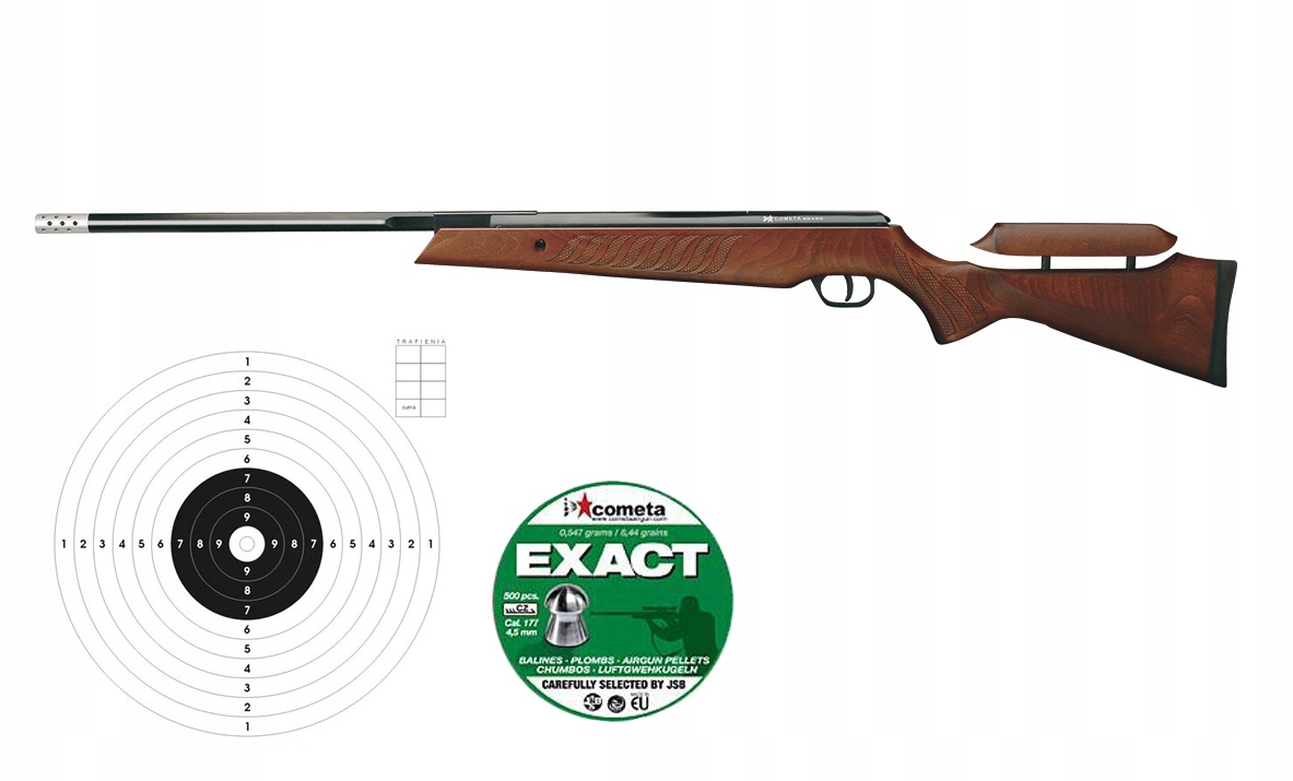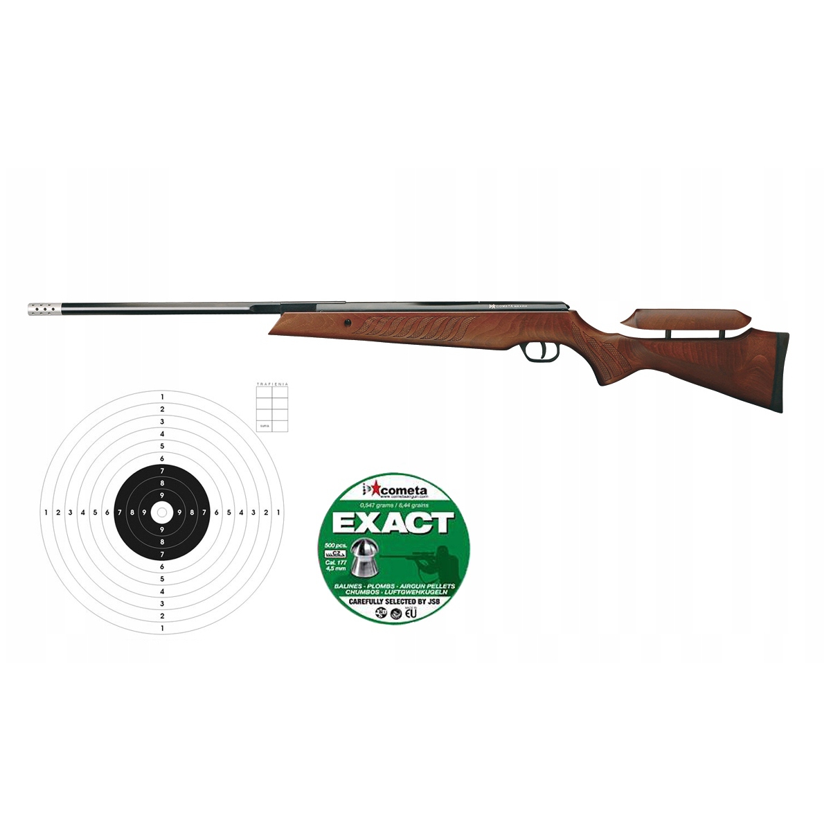 W zestawie: wiatrówka Cometa Fusion Star 4,5 mm, opakowanie Śrutu JSB Exact 4,5 mm, komplet 50szt tarcz 14x14 cm.