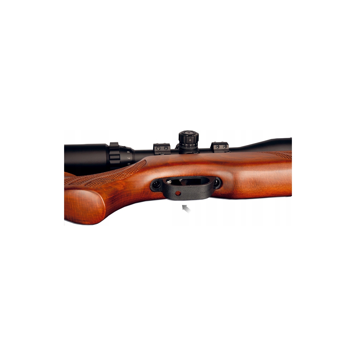 - Wiatrówka została wyposażona w automatyczny bezpiecznik, który po naciągnięciu sprężyny automatycznie blokuje spust uniemożliwiając oddanie niekontrolowanego strzału.