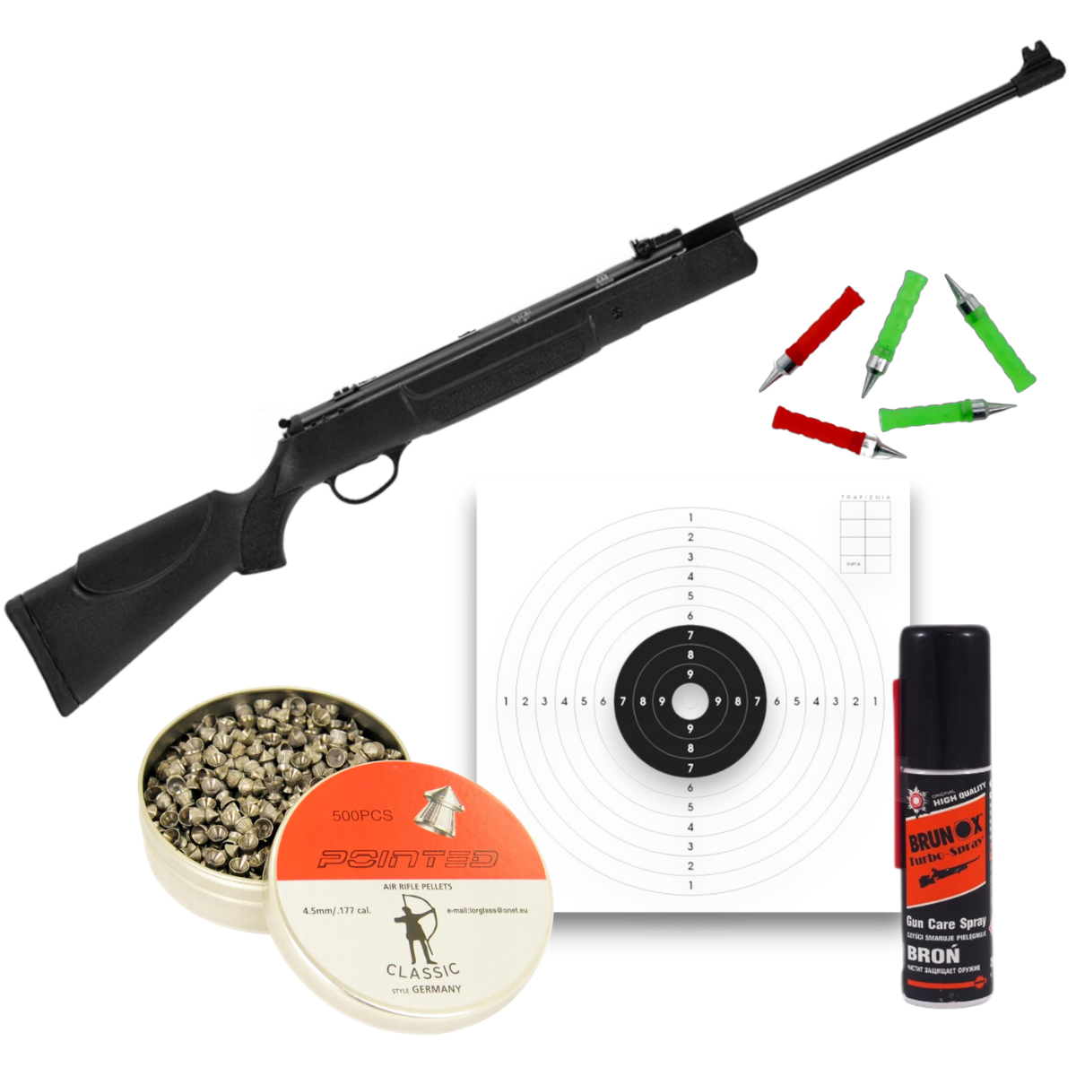 W zestawie: karabinek Hatsan 90 gen-2 VORTEX 4,5, olejek Brunox 25ml, opakowanie śrutu 250szt 4,5mm, komplet tarcz 14x14cm, 10 szt lotek 4,5mm.