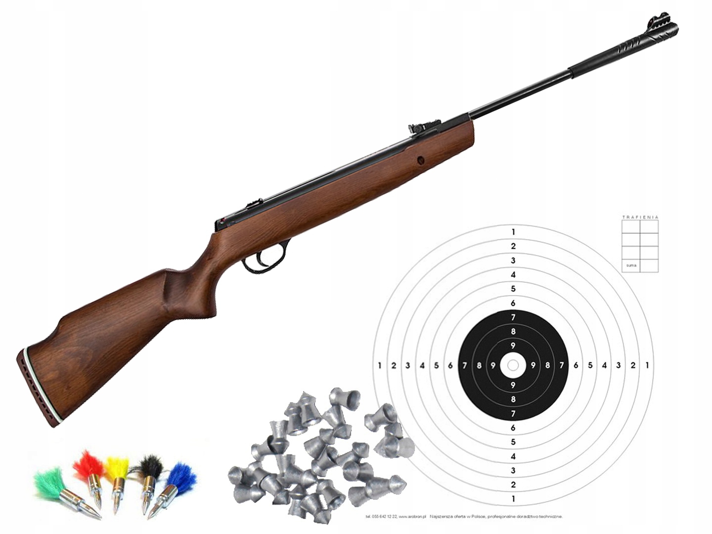 W zestawie: karabinek Apachi 1100X 4,5mm, opakowanie śrutu 250szt 4,5mm, komplet tarcz 14x14cm, 5szt lotek 4,5mm.