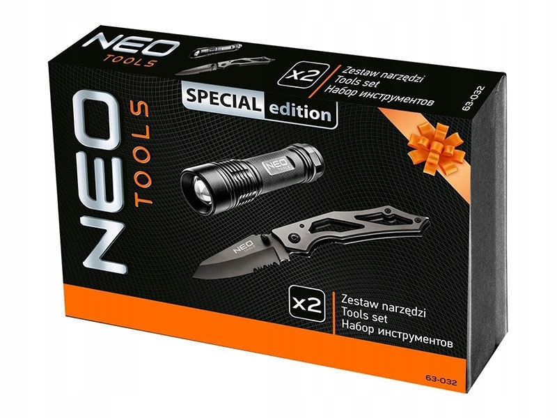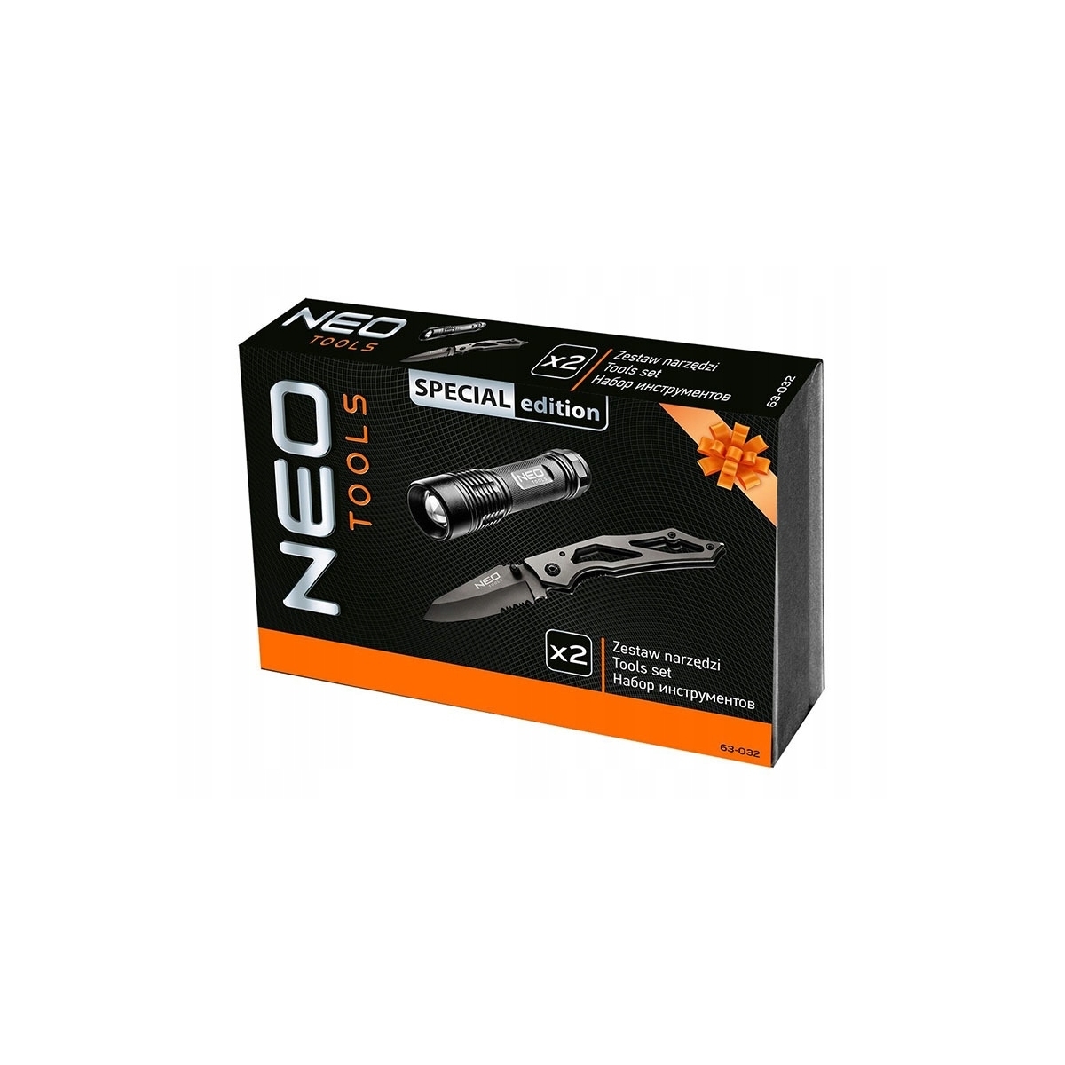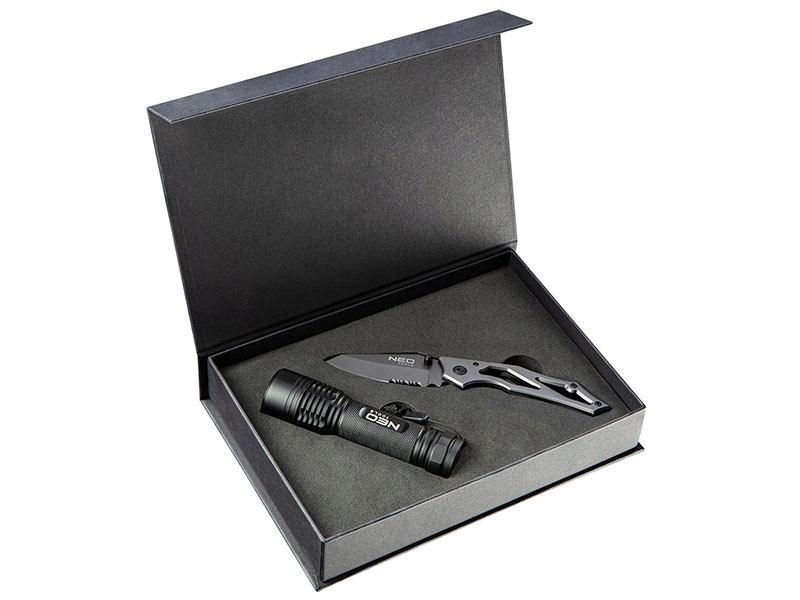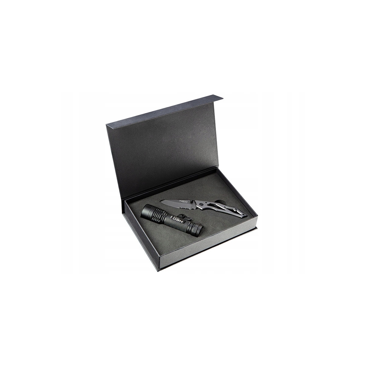 Nóż składany + Latarka 2w1 SET NEO TOOLS - zestaw dwóch użytecznych narzędzi.