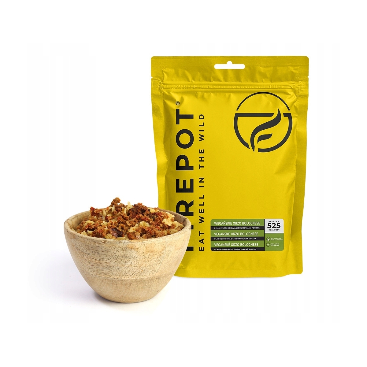 Żywność liofilizowana FIREPOT Wegańskie Orzo Bolognese - jest to sos pomidorowy z dodatkiem oregano i bogatej w białko soi, serwowany z makaronem typu Orzo (przypominającym ziarenka ryżu).