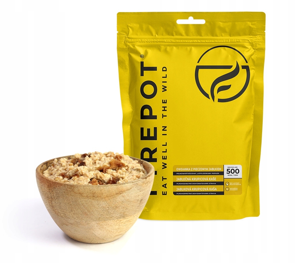 Żywność liofilizowana FIREPOT Owsianka z jabłkiem - jest to rozgrzewające, pożywne śniadanie z organicznych płatków owsianych, serwowanych z kawałkami jabłek zapiekanych z rodzynkami, cukrem Demerara, cytryną, imbirem i cynamonem.